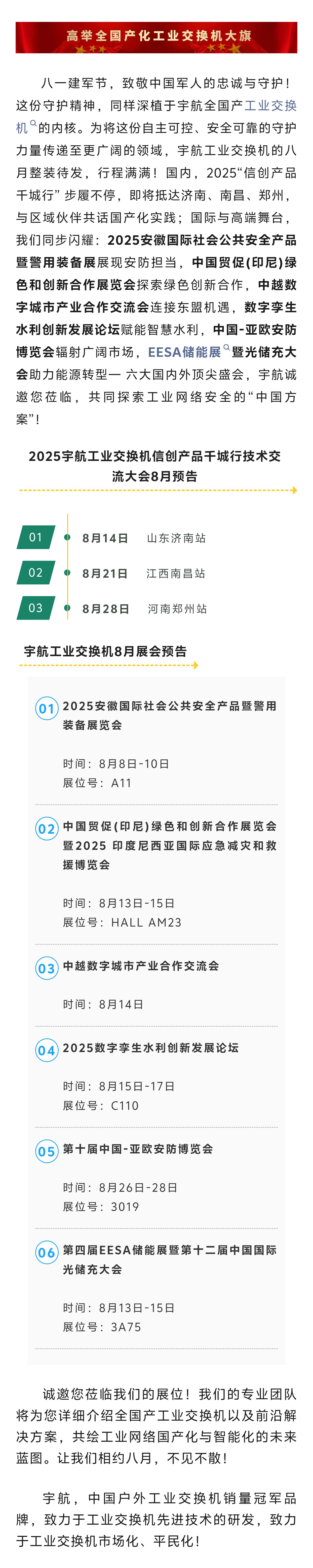 【致敬中國(guó)軍人】宇航工業(yè)交換機(jī)8月全國(guó)展會(huì)活動(dòng)行程邀約!