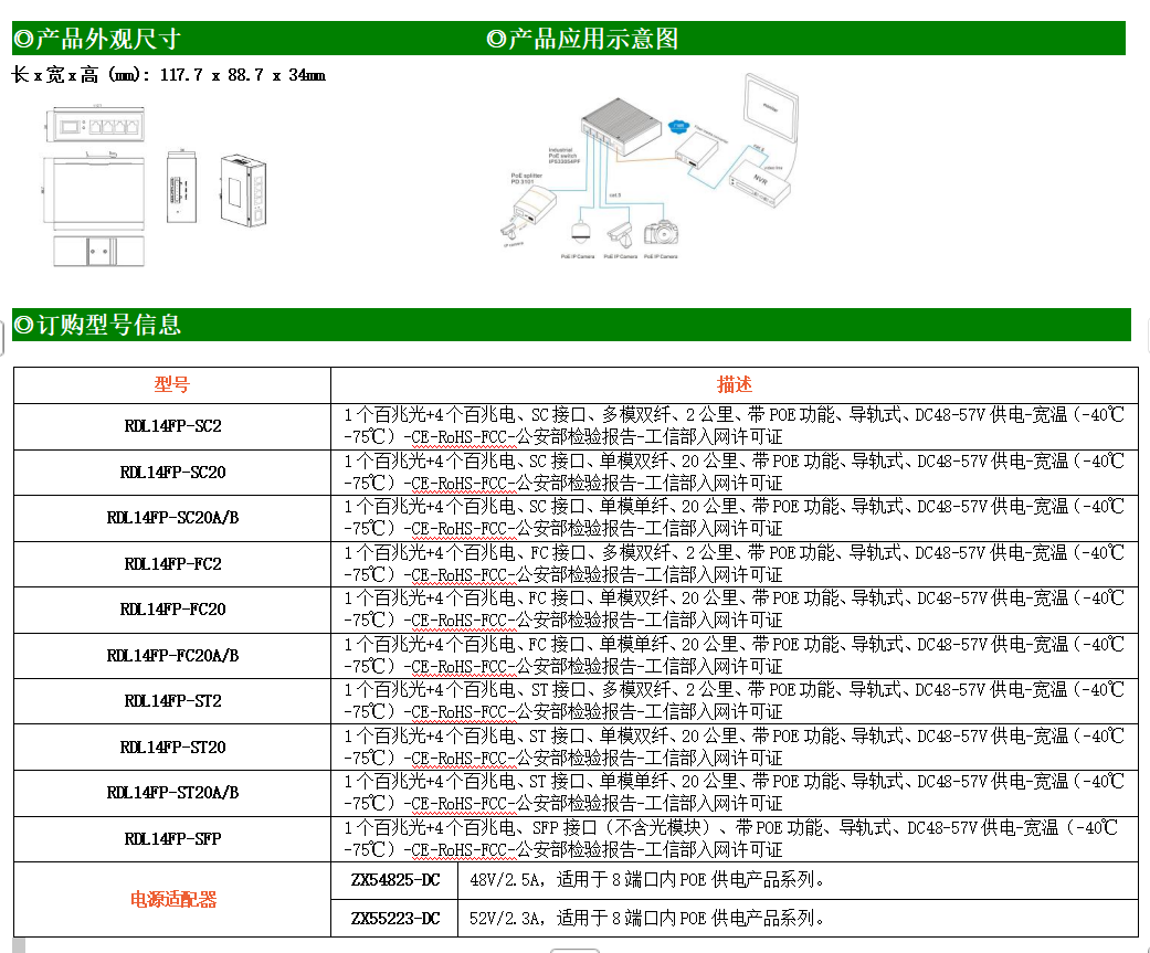4路百兆POE電口+1路百兆SC光口工業(yè)級以太網(wǎng)POE交換機,支持4個10/100Base-TX電口和1個100Base-X光口。產(chǎn)品符合FCC、CE、ROHS標準。RDL14FP系列交換機具有-40℃~75℃的工作溫度,具有超強的堅固度能適應(yīng)各種嚴苛環(huán)境,也可以非常方便的安置在空間緊湊的控制箱中。導(dǎo)軌的安裝特性、寬溫操作及擁有IP40防護等級的外殼及LED指示燈,使RDL14FP成為一個即插即用的工業(yè)級設(shè)備,為用戶的以太網(wǎng)設(shè)備聯(lián)網(wǎng)提供可靠、便捷的解決方案。