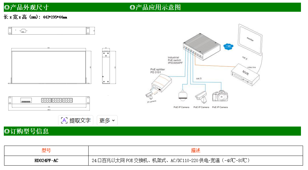 24路百兆POE電口工業(yè)級(jí)以太網(wǎng)交換機(jī),支持24個(gè)10Base-T/100Base-TX電口,所有PoE端口符合IEEE802.3af/at標(biāo)準(zhǔn)。產(chǎn)品符合FCC、CE、ROHS標(biāo)準(zhǔn)。RD024FP-AC交換機(jī)具有-40℃~80℃的工作溫度,具有超強(qiáng)的堅(jiān)固度能適應(yīng)各種嚴(yán)苛環(huán)境,也可以非常方便的安置在空間緊湊的控制箱中。機(jī)架式的安裝特性、寬溫操作及擁有IP40防護(hù)等級(jí)的外殼及LED指示燈,使RD024FP-AC成為一個(gè)即插即用的工業(yè)級(jí)設(shè)備,為用戶的以太網(wǎng)設(shè)備聯(lián)網(wǎng)提供可靠、便捷的解決方案。