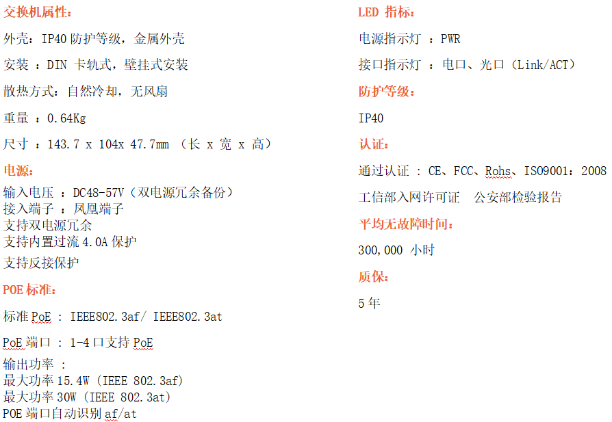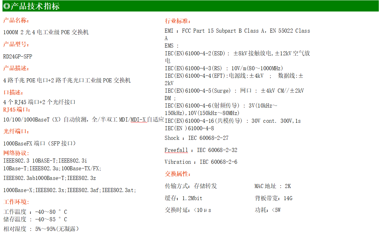 4路千兆POE電口+2路千兆FX光口工業(yè)級以太網(wǎng)POE交換機,支持4個10/100/1000Base-TX電口和2個1000Base-X光口。產(chǎn)品符合FCC、CE、ROHS標準。RD24GP-SFP交換機具有-40℃~80℃的工作溫度,具有超強的堅固度能適應(yīng)各種嚴苛環(huán)境,也可以非常方便的安置在空間緊湊的控制箱中。導(dǎo)軌的安裝特性、寬溫操作及擁有IP40防護等級的外殼及LED指示燈,使RD24GP-SFP成為一個即插即用的工業(yè)級設(shè)備,為用戶的以太網(wǎng)設(shè)備聯(lián)網(wǎng)提供可靠、便捷的解決方案。