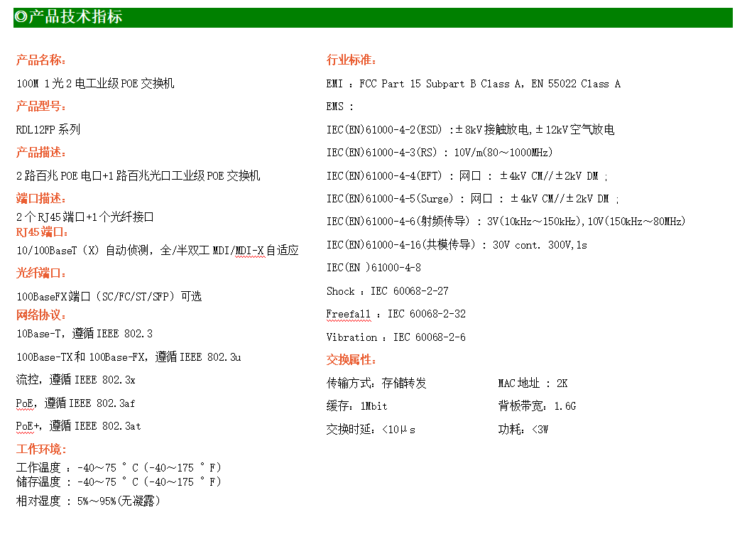 2路百兆POE電口+1路百兆SFP光口工業級以太網POE交換機,支持2個10/100Base-TX電口和1個100Base-X光口。產品符合FCC、CE、ROHS標準。RDL12FP系列交換機具有-40℃~75℃的工作溫度,具有超強的堅固度能適應各種嚴苛環境,也可以非常方便的安置在空間緊湊的控制箱中。導軌的安裝特性、寬溫操作及擁有IP40防護等級的外殼及LED指示燈,使RDL12FP成為一個即插即用的工業級設備,為用戶的以太網設備聯網提供可靠、便捷的解決方案。