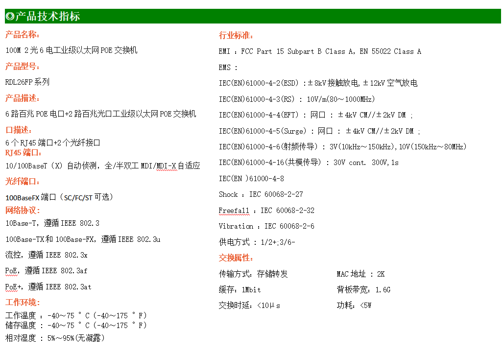 6路百兆POE電口+2路百兆FX光口工業級以太網交換機,支持6個10Base-T/100Base-TX電口和2個100Base-X光口。產品符合FCC、CE、ROHS標準。RDL26FP系列交換機具有-40℃~75℃的工作溫度,具有超強的堅固度能適應各種嚴苛環境,也可以非常方便的安置在空間緊湊的控制箱中。導軌的安裝特性、寬溫操作及擁有IP40防護等級的外殼及LED指示燈,使RDL26FP成為一個即插即用的工業級設備,為用戶的以太網設備聯網提供可靠、便捷的解決方案。