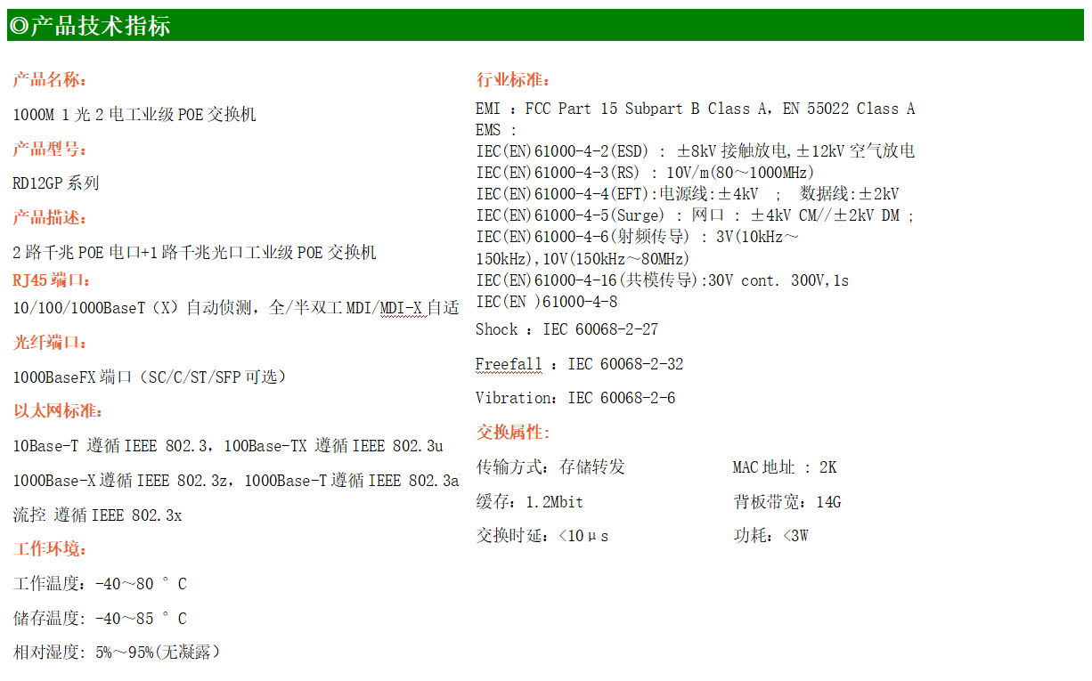 2路千兆POE電口+1路千兆FX光口工業(yè)級以太網(wǎng)POE交換機,支持2個10/100/1000Base-TX電口和1個1000Base-X光口。產(chǎn)品符合FCC、CE、ROHS標準。RD12GP系列交換機具有-40℃~80℃的工作溫度,具有超強的堅固度能適應各種嚴苛環(huán)境,也可以非常方便的安置在空間緊湊的控制箱中。導軌的安裝特性、寬溫操作及擁有IP40防護等級的外殼及LED指示燈,使RD12GP成為一個即插即用的工業(yè)級設備,為用戶的以太網(wǎng)設備聯(lián)網(wǎng)提供可靠、便捷的解決方案。