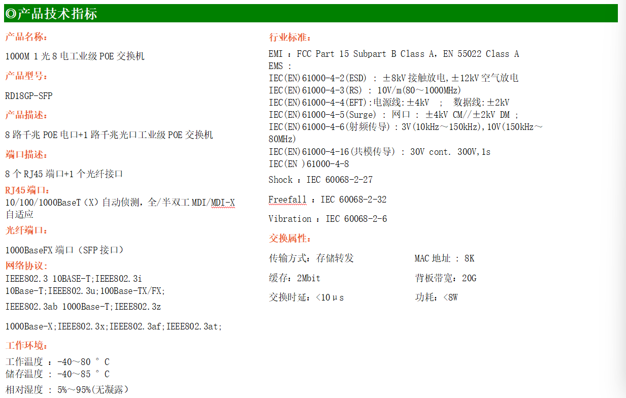8路千兆POE電口+1路千兆FX光口工業級以太網POE交換機,支持8個10/100/1000Base-TX電口和1個1000Base-X光口。產品符合FCC、CE、ROHS標準。RD18GP交換機具有-40℃~80℃的工作溫度,具有超強的堅固度能適應各種嚴苛環境,也可以非常方便的安置在空間緊湊的控制箱中。導軌的安裝特性、寬溫操作及擁有IP40防護等級的外殼及LED指示燈,使RD18GP成為一個即插即用的工業級設備,為用戶的以太網設備聯網提供可靠、便捷的解決方案。