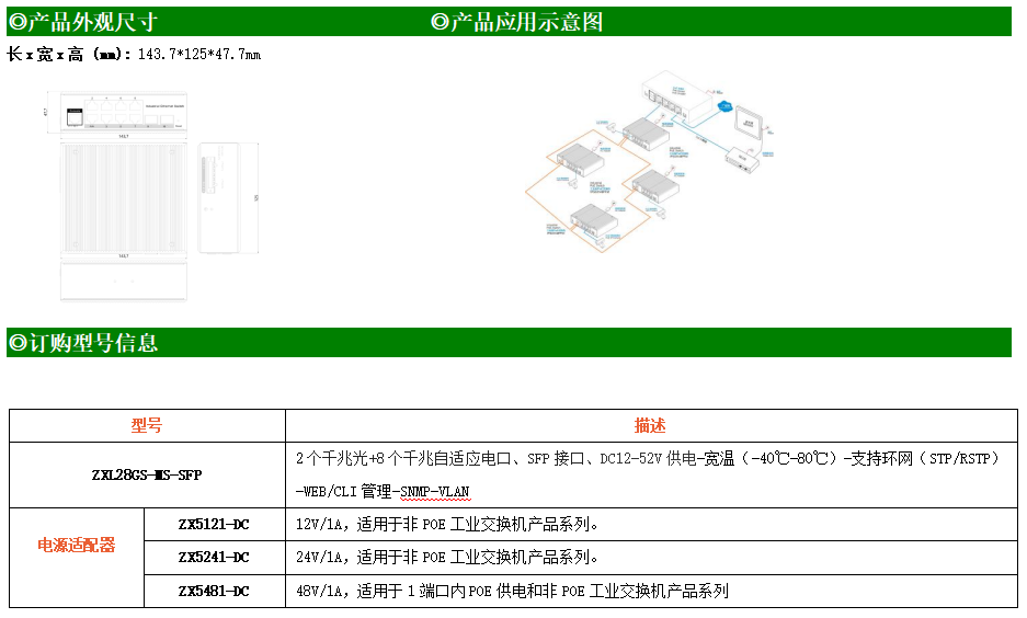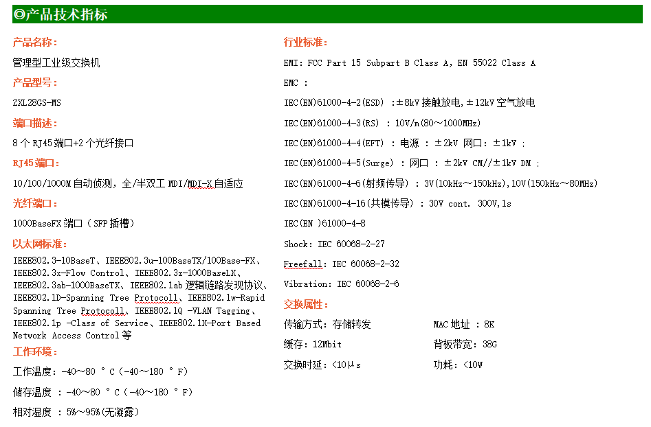 ZXL28GS-MS是網管型工業以太網交換機,產品符合FCC、CE、RoHS標準。支持2個千兆光口和8個千兆電口;支持工業現場所需的以太網二層協議,保證通信網絡的穩定性;該系列交換機采用低功耗、無風扇設計,確保無噪聲干擾,同時支持-40~80℃工作溫度和良好的EMC電磁兼容性能,保證在惡劣的工業環境中保持穩定的工作,為工廠自動化,智能交通,視頻監控等工業應用領域組建快速穩定的網絡終端接入網絡提供安全可靠的解決方案。