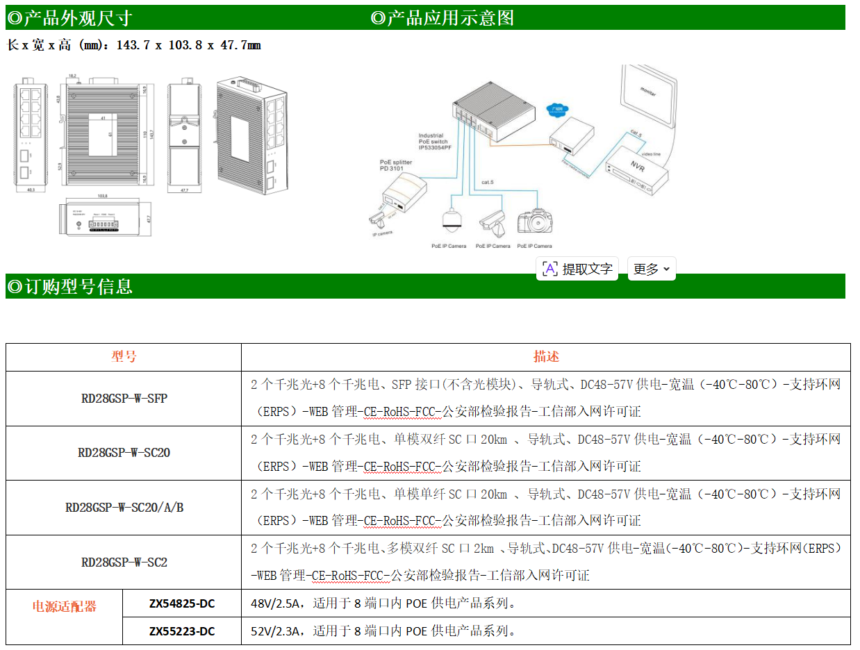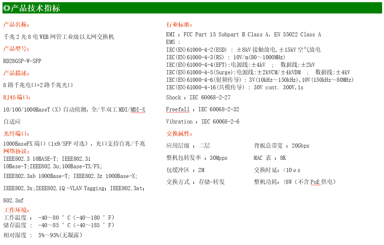 RD28GSP-W-SFP系列WEB管理工業級以太網PoE交換機,產品符合FCC、CE、ROHS標準,支持工業現場所需的以太網二層協議,保證通信網絡的穩定性。該系列交換機采用低功耗、無風扇設計,確保無噪聲干擾,同時支持-40~80℃工作溫度和良好的EMC電磁兼容性能,保證在惡劣的工業環境中保持穩定的工作,為工廠自動化,智能交通,視頻監控等工業應用領域組建快速穩定的網絡終端接入網絡提供安全可靠的解決方案。
