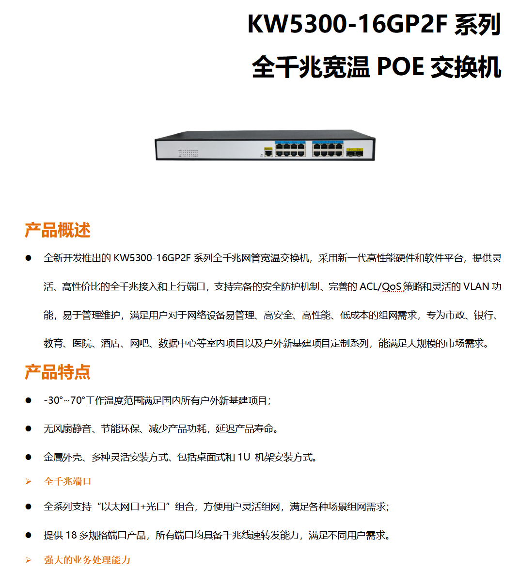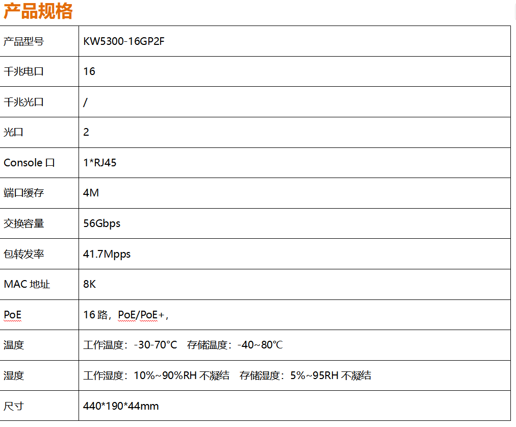 全新開發推出的KW5300-16GP2F系列全千兆網管寬溫交換機,采用新一代高性能硬件和軟件平臺,提供靈活、高性價比的全千兆接入和上行端口,支持完備的安全防護機制、完善的ACL/QoS策略和靈活的VLAN功能,易于管理維護,滿足用戶對于網絡設備易管理、高安全、高性能、低成本的組網需求,專為市政、銀行、教育、醫院、酒店、網吧、數據中心等室內項目以及戶外新基建項目定制系列,能滿足大規模的市場需求。