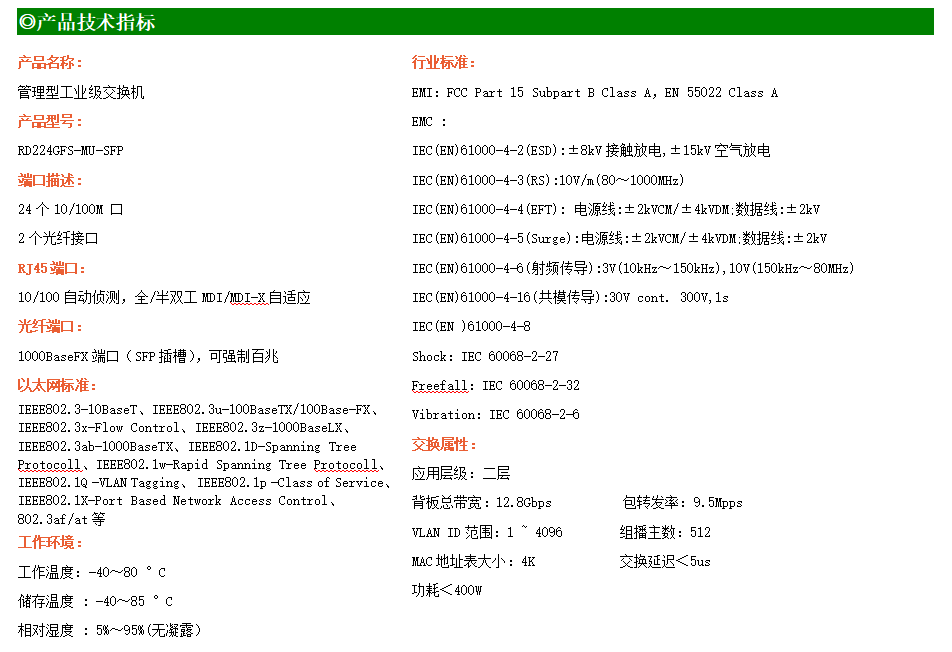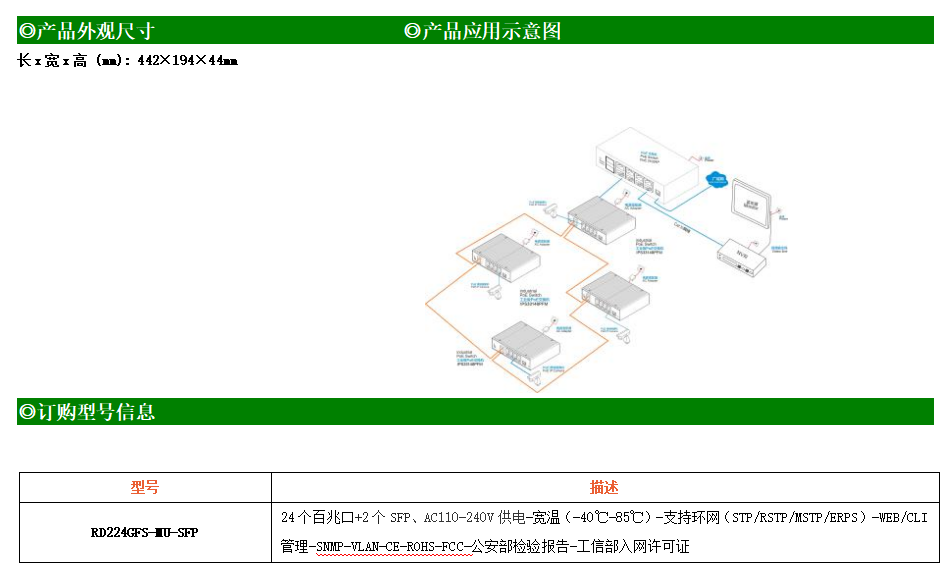 RD224GFSP-MU-AC-SFP是網管型工業以太網PoE交換機,產品符合FCC、CE、RoHS標準。可提供24個百兆PoE端口,所有PoE端口符合IEEE802.3af/at標準。支持工業現場所需的以太網二層協議,保證通信網絡的穩定性;該系列交換機采用低功耗、無風扇設計,確保無噪聲干擾,同時支持-40~85℃工作溫度和良好的EMC電磁兼容性能,保證在惡劣的工業環境中保持穩定的工作,為工廠自動化,智能交通,視頻監控等工業應用領域組建快速穩定的網絡終端接入網絡提供安全可靠的解決方案。