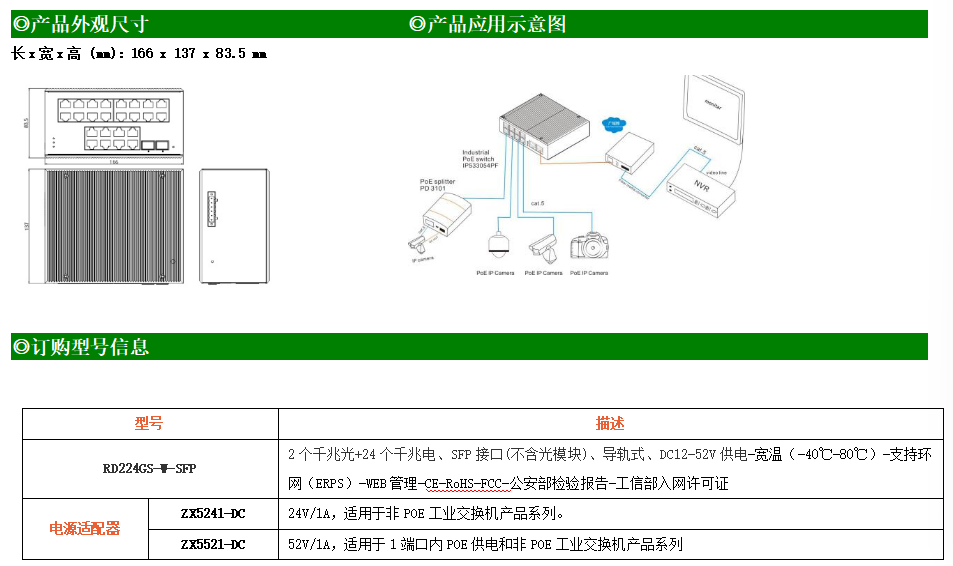 RD224GS-W系列WEB網管工業級以太網交換機,產品符合FCC、CE、ROHS標準,支持工業現場所需的以太網二層協議,保證通信網絡的穩定性。該系列交換機采用低功耗、無風扇設計,確保無噪聲干擾,同時支持-40~80℃工作溫度和良好的EMC電磁兼容性能,保證在惡劣的工業環境中保持穩定的工作,為工廠自動化,智能交通,視頻監控等工業應用領域組建快速穩定的網絡終端接入網絡提供安全可靠的解決方案。