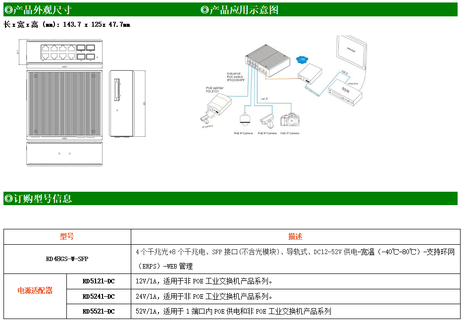 RD48GS-W-SFP系列WEB網管工業級以太網交換機,產品符合FCC、CE、ROHS標準,支持工業現場所需的以太網二層協議,保證通信網絡的穩定性。該系列交換機采用低功耗、無風扇設計,確保無噪聲干擾,同時支持-40~80℃工作溫度和良好的EMC電磁兼容性能,保證在惡劣的工業環境中保持穩定的工作,為工廠自動化,智能交通,視頻監控等工業應用領域組建快速穩定的網絡終端接入網絡提供安全可靠的解決方案。