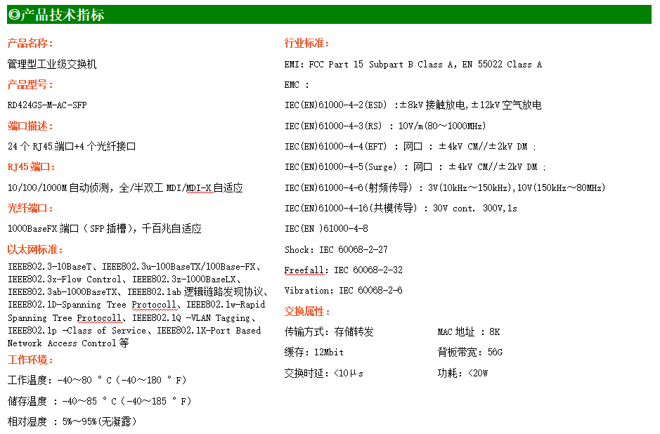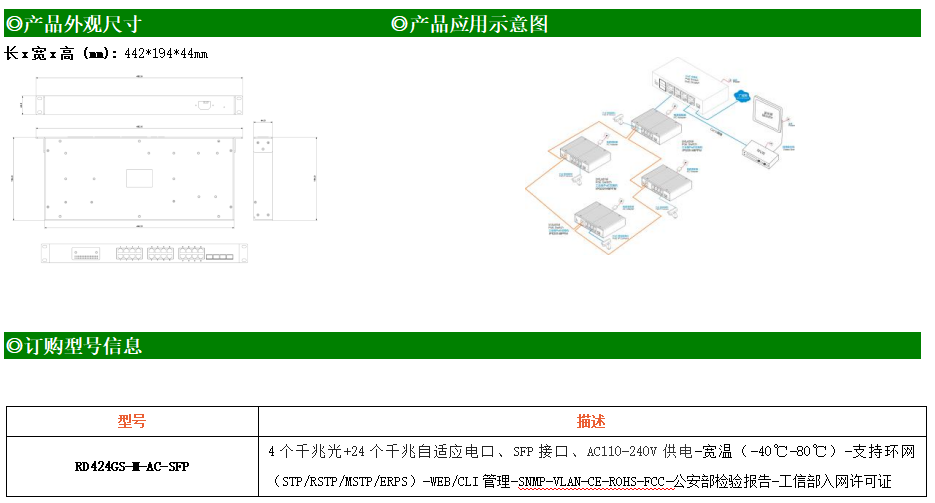 RD424GS-M-AC-SFP是網(wǎng)管型工業(yè)以太網(wǎng)交換機(jī),產(chǎn)品符合FCC、CE、RoHS標(biāo)準(zhǔn)。支持4個(gè)千兆光口和24個(gè)千兆電口;支持工業(yè)現(xiàn)場(chǎng)所需的以太網(wǎng)二層協(xié)議,保證通信網(wǎng)絡(luò)的穩(wěn)定性;該系列交換機(jī)采用低功耗、無風(fēng)扇設(shè)計(jì),確保無噪聲干擾,同時(shí)支持-40~80℃工作溫度和良好的EMC電磁兼容性能,保證在惡劣的工業(yè)環(huán)境中保持穩(wěn)定的工作,為工廠自動(dòng)化,智能交通,視頻監(jiān)控等工業(yè)應(yīng)用領(lǐng)域組建快速穩(wěn)定的網(wǎng)絡(luò)終端接入網(wǎng)絡(luò)提供安全可靠的解決方案。