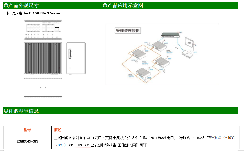 RD8MS6TP-SFP交換機是我司推出的一款萬兆三層工業以太網交換機,產品符合FCC、CE、RoHS標準。可提供8個2.5G PoE端口,所有PoE端口符合IEEE802.3af/at/bt標準。具備先進的硬件處理能力和最豐富的業務特性。支持IPv4/IPv6 硬件雙棧及線速轉發,使客戶能夠從容應對即將帶來的IPv6 時代其提供高容量的交換能力。RD8MS6TP-SFP交換機具有-40℃~70℃的工作溫度,具有超強的堅固度能適應各種嚴苛環境。導軌式安裝特性、寬溫操作,使RD8MS6TP-SFP的交換機成為一個即插即用的工業級設備,為用戶的以太網設備聯網提供可靠、便捷的解決方案。