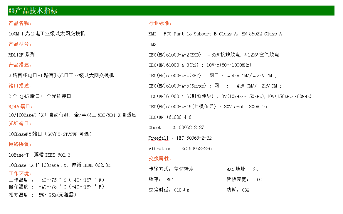 2路百兆電口+1路百兆FX光口工業級以太網交換機,支持2個10Base-T/100Base-TX電口和1個100Base-X光口。產品符合FCC、CE、ROHS標準。RDL12F系列交換機具有-40℃~75℃的工作溫度,具有超強的堅固度能適應各種嚴苛環境,也可以非常方便的安置在空間緊湊的控制箱中。導軌的安裝特性、寬溫操作及擁有IP40防護等級的外殼及LED指示燈,使RDL12F成為一個即插即用的工業級設備,為用戶的以太網設備聯網提供可靠、便捷的解決方案。