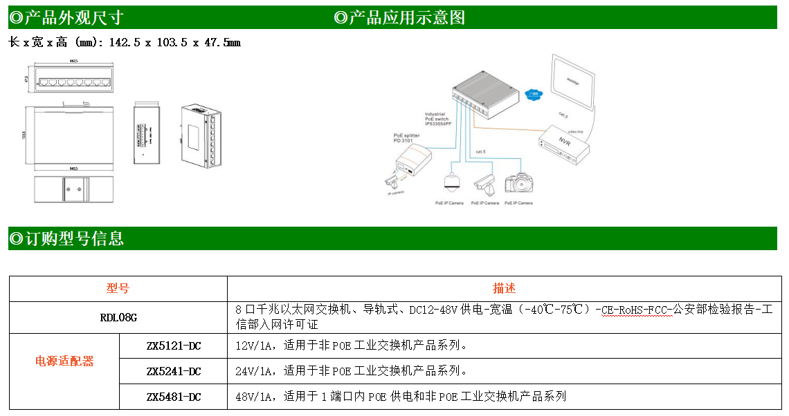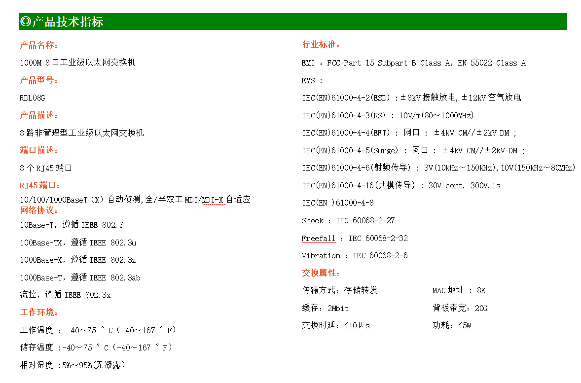 8路千兆電口工業級以太網交換機,支持8個10Base-T/100Base-T/1000Base-TX電口。產品符合FCC、CE、ROHS標準。RD08G交換機具有-40℃~80℃的工作溫度,具有超強的堅固度能適應各種嚴苛環境,也可以非常方便的安置在空間緊湊的控制箱中。導軌的安裝特性、寬溫操作及擁有IP40防護等級的外殼及LED指示燈,使RD08G成為一個即插即用的工業級設備,為用戶的以太網設備聯網提供可靠、便捷的解決方案。
