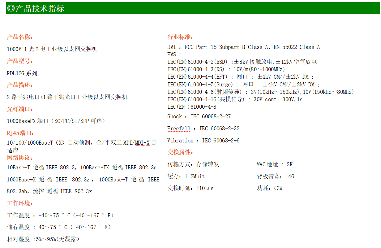 2路千兆電口+1路千兆FX光口工業級以太網交換機,支持2個100Base-T/1000Base-TX電口和1個1000Base-X光口。產品符合FCC、CE、ROHS標準。RDL12G系列交換機具有-40℃~75℃的工作溫度,具有超強的堅固度能適應各種嚴苛環境,也可以非常方便的安置在空間緊湊的控制箱中。導軌的安裝特性、寬溫操作及擁有IP40防護等級的外殼及LED指示燈,使RDL12G成為一個即插即用的工業級設備,為用戶的以太網設備聯網提供可靠、便捷的解決方案。