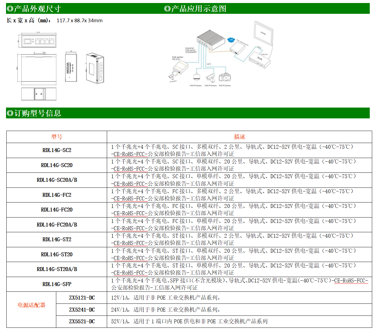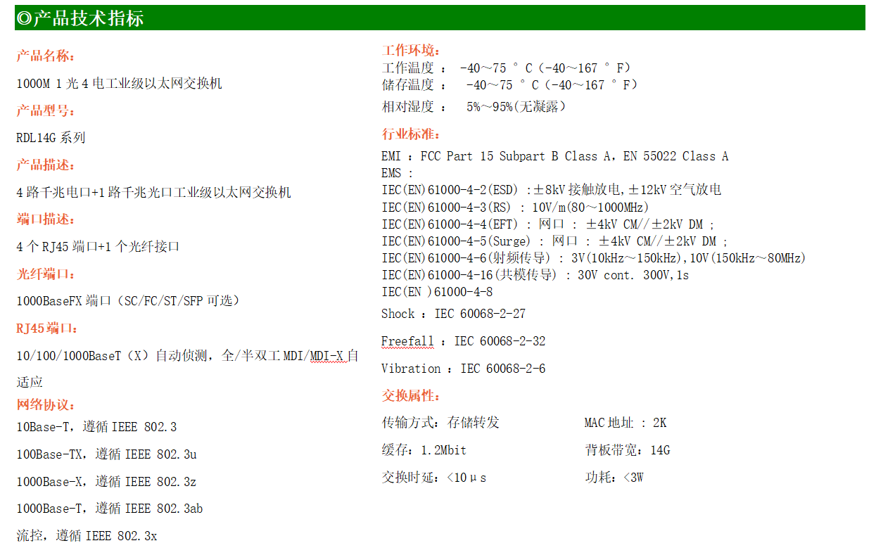 4路千兆電口+1路千兆FX光口工業(yè)級以太網交換機,支持4個100Base-T/1000Base-TX電口和1個1000Base-X光口。產品符合FCC、CE、ROHS標準。RDL14G系列交換機具有-40℃~75℃的工作溫度,具有超強的堅固度能適應各種嚴苛環(huán)境,也可以非常方便的安置在空間緊湊的控制箱中。導軌的安裝特性、寬溫操作及擁有IP40防護等級的外殼及LED指示燈,使RDL14G系列成為一個即插即用的工業(yè)級設備,為用戶的以太網設備聯網提供可靠、便捷的解決方案。