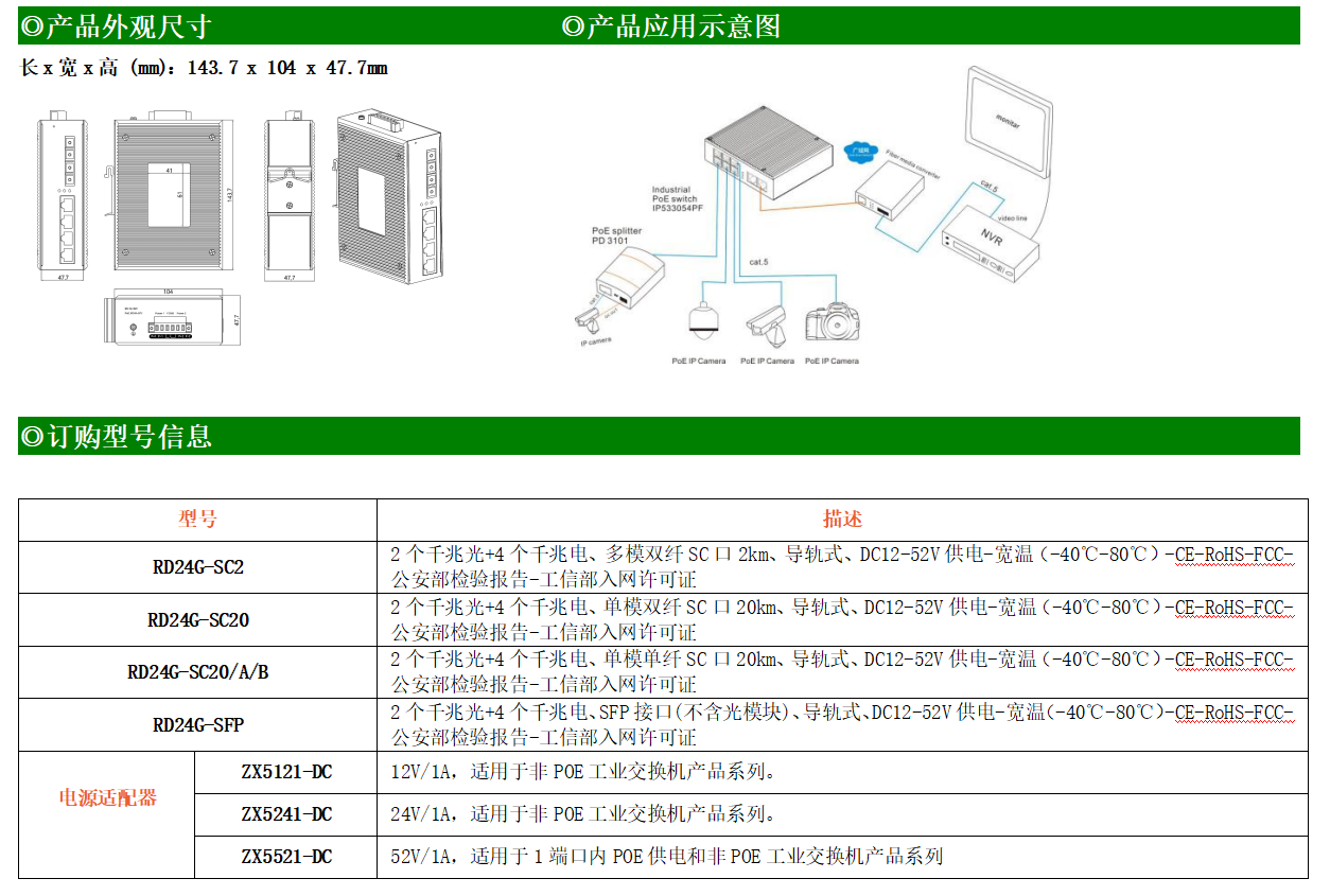 4路千兆電口+2路千兆FX光口工業級以太網交換機,支持4個100Base-T/1000Base-TX電口和2個1000Base-X光口。產品符合FCC、CE、ROHS標準。RD24G交換機具有-40℃~80℃的工作溫度,具有超強的堅固度能適應各種嚴苛環境,也可以非常方便的安置在空間緊湊的控制箱中。導軌的安裝特性、寬溫操作及擁有IP40防護等級的外殼及LED指示燈,使RD24G成為一個即插即用的工業級設備,為用戶的以太網設備聯網提供可靠、便捷的解決方案。