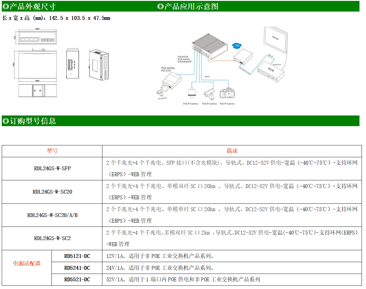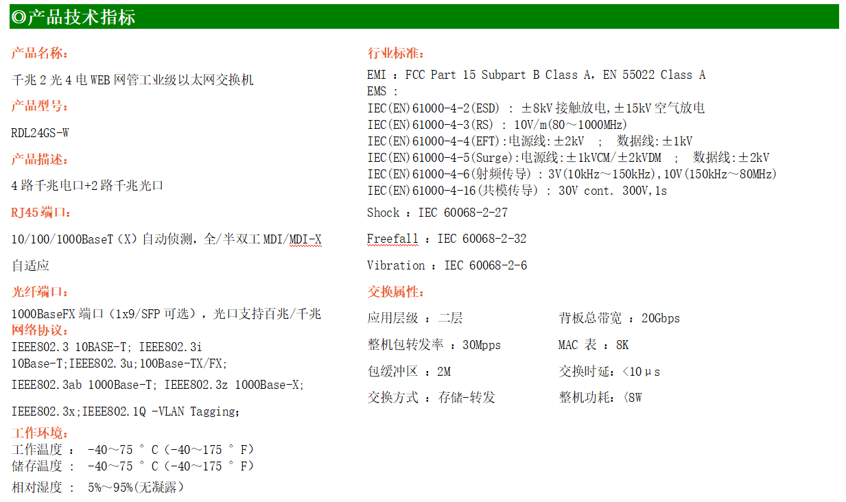 RDL24GS-W-SFP系列WEB網管工業級以太網交換機,產品符合FCC、CE、ROHS標準,支持工業現場所需的以太網二層協議,保證通信網絡的穩定性。該系列交換機采用低功耗、無風扇設計,確保無噪聲干擾,同時支持-40~75℃工作溫度和良好的EMC電磁兼容性能,保證在惡劣的工業環境中保持穩定的工作,為工廠自動化,智能交通,視頻監控等工業應用領域組建快速穩定的網絡終端接入網絡提供安全可靠的解決方案。