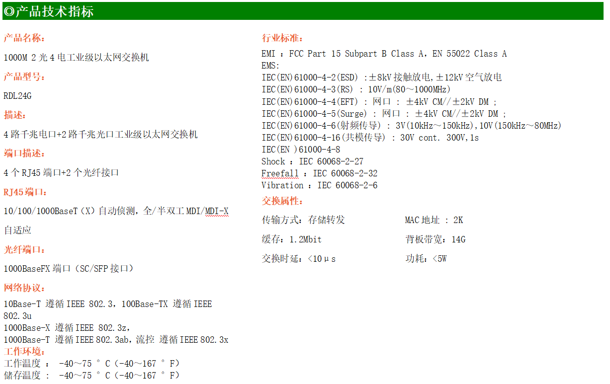 4路千兆電口+2路千兆FX光口工業(yè)級(jí)以太網(wǎng)交換機(jī),支持4個(gè)100Base-T/1000Base-TX電口和2個(gè)1000Base-X光口。產(chǎn)品符合FCC、CE、ROHS標(biāo)準(zhǔn)。RDL24G交換機(jī)具有-40℃~75℃的工作溫度,具有超強(qiáng)的堅(jiān)固度能適應(yīng)各種嚴(yán)苛環(huán)境,也可以非常方便的安置在空間緊湊的控制箱中。導(dǎo)軌的安裝特性、寬溫操作及擁有IP40防護(hù)等級(jí)的外殼及LED指示燈,使RDL24G成為一個(gè)即插即用的工業(yè)級(jí)設(shè)備,為用戶的以太網(wǎng)設(shè)備聯(lián)網(wǎng)提供可靠、便捷的解決方案。